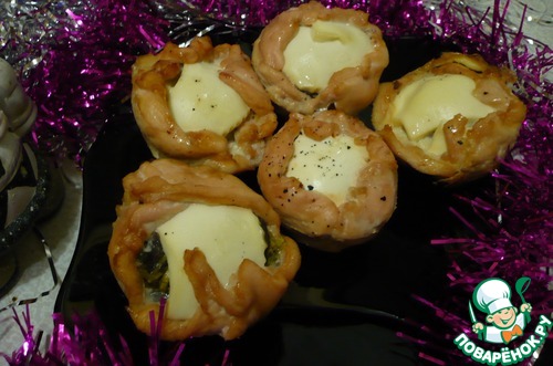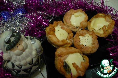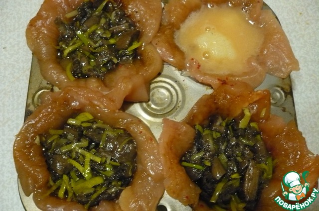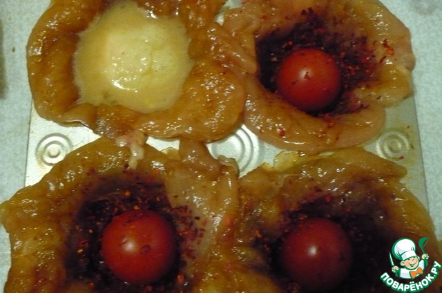 В оригинале идет сыр Моцарелла. Но такой я не нашла и использовала мягкий деревенский сыр. Нарезаем небольшими кружками и кладем сверху на все начинки. Закрываем края свисавшим филе. Можно посыпать сверху перцем.