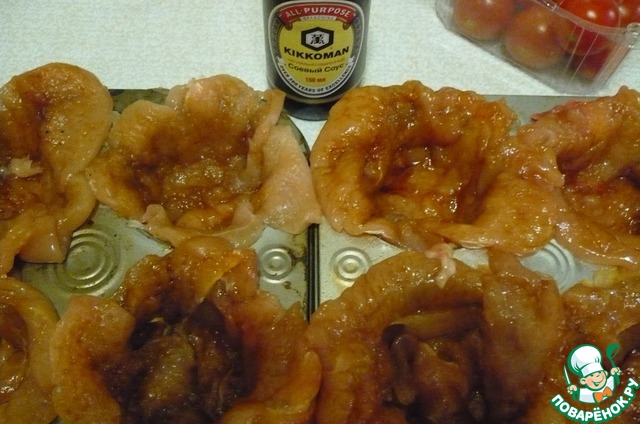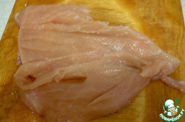 Куриное филе промыть, просушить и распластать. Из 1 филе получается 2 таких заготовки. То есть всего их будет 8 штук.