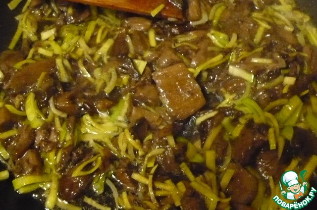 Обжаренные грибы положить на сковороду, добавить тонко резанный лук - порей. Пережарить 5-10 мин. до мягкости лука. Я брала грибы, которые заготавливала на зиму, они уже соленые.