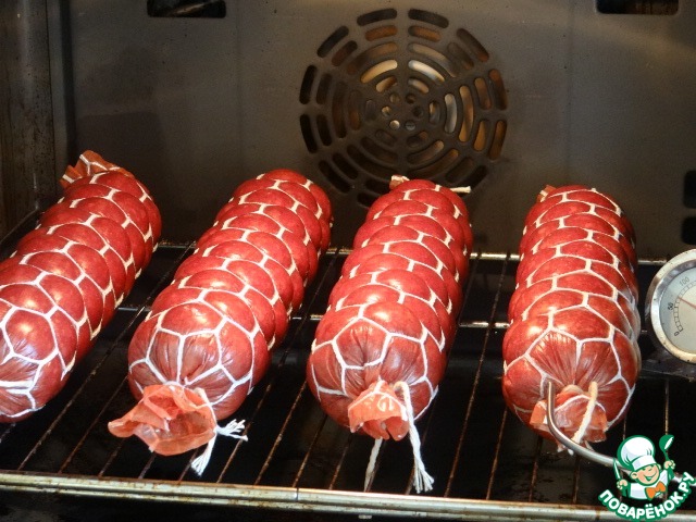 Воткнуть в одну из колбас температурный датчик, уложить батоны на решетку д/ш;