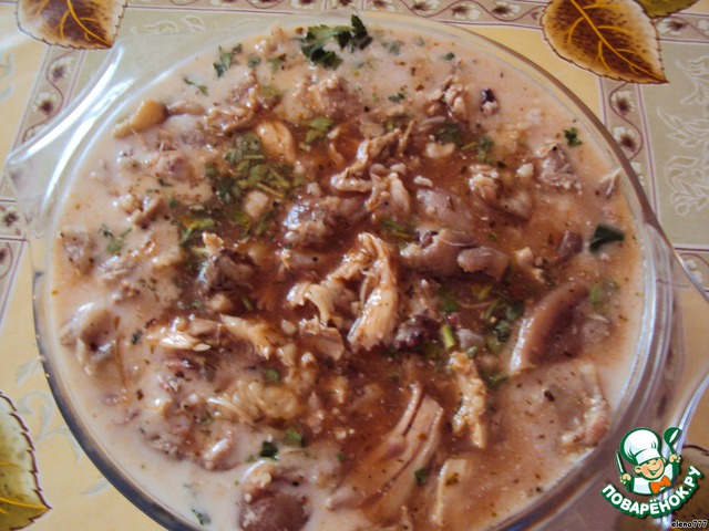 Итак, приправу или желатин (приготовить по инструкции на пакетике) замочить в одном стакане холодного бульона. Бульон остаётся от варки мяса, нам надо смешать куриный и мясной бульоны, всего понадобится 3 стакана.