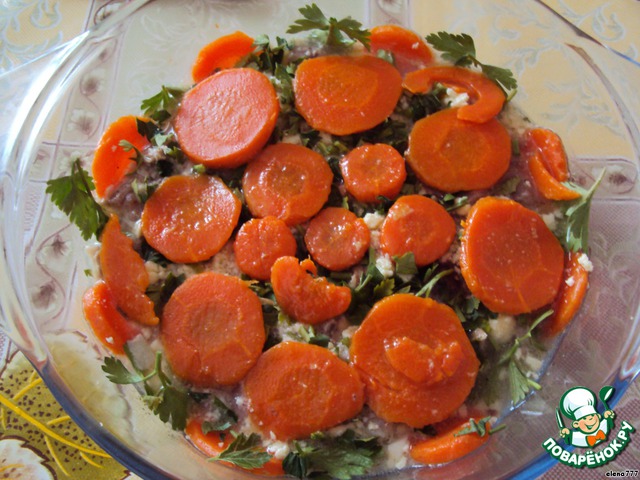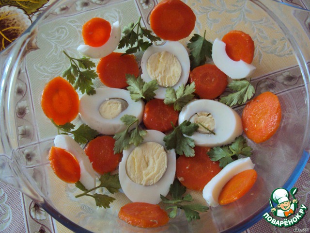 На дно формы для холодца (я взяла стеклянную кастрюльку для СВЧ) выложить кружочки моркови, яиц и зелень.