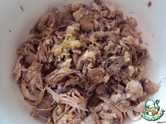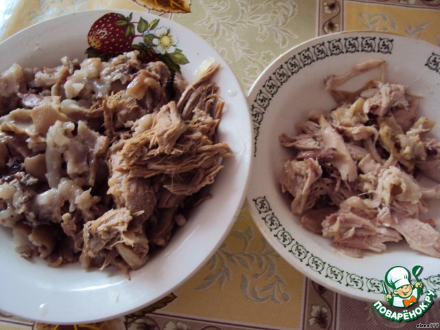 Готовую свинину расщипать, ножки разобрать, освободить от мосоликов.