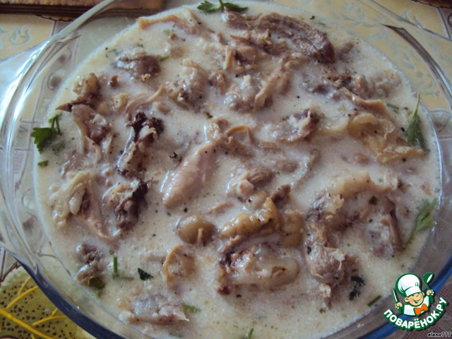 Дальше выложить ещё одну часть мяса, залить стаканом бульона, смешанным с майонезом. Снова на холод.