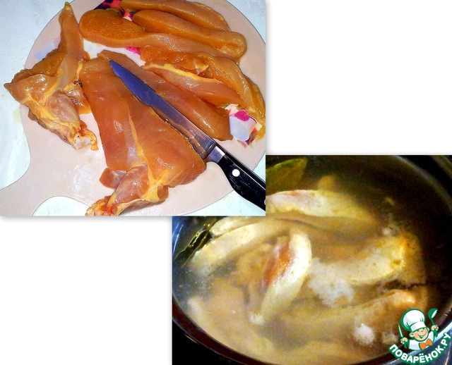 Куриное филе нарезала брусочками и сварила до полуготовности со специями и приправами.
