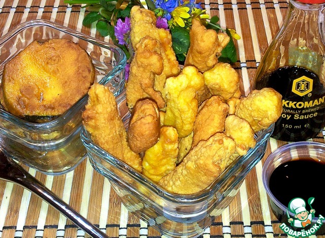 Куриные брусочки и кружочки цуккини макали в соевый соус.