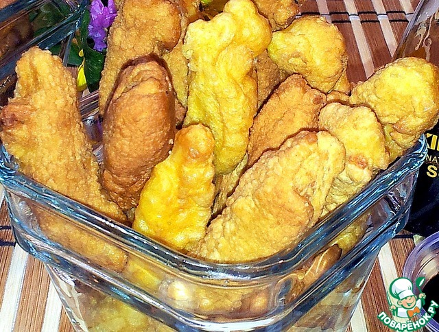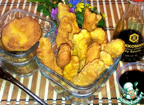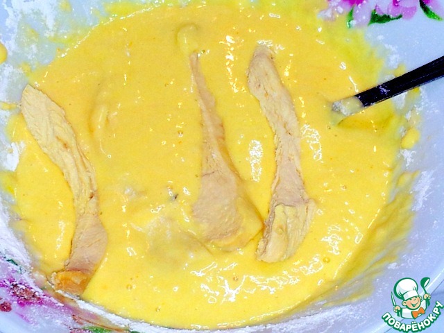 Куриные брусочки обмакнула в кляре и обжарила в кипящем масле до румяности со всех сторон. ( Кастрюлю использовала маленького диаметра. )