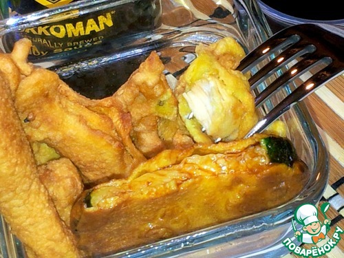 Кляр у меня остался и я обжарила половину цуккини нарезанный кольцами. Цуккини внутри получился очень сочным.