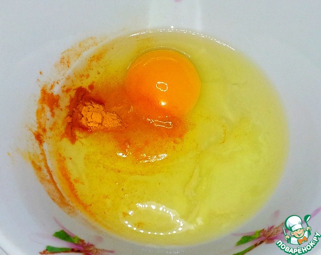 Для кляра разбила в миску яйцо и добавила один белок ( остался от предыдущего рецепта. ) В миску насыпала соль, куркуму, чесночный порошок и перец кайен.