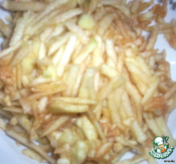 Нарезать тонкими ломтиками ветчину. Натереть на крупной терке яблоко, сбрызнуть его лимонным соком.