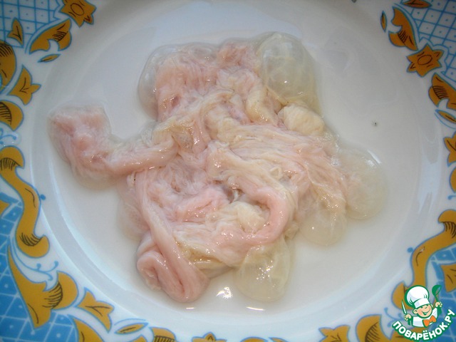 Череву промыть от соли (у меня была промытая и очищенная в пучках), осталось только промыть от соли. Чтобы промыть внутри, аккуратно расправляем край и немного натягиваем на кран, моем холодной водой.