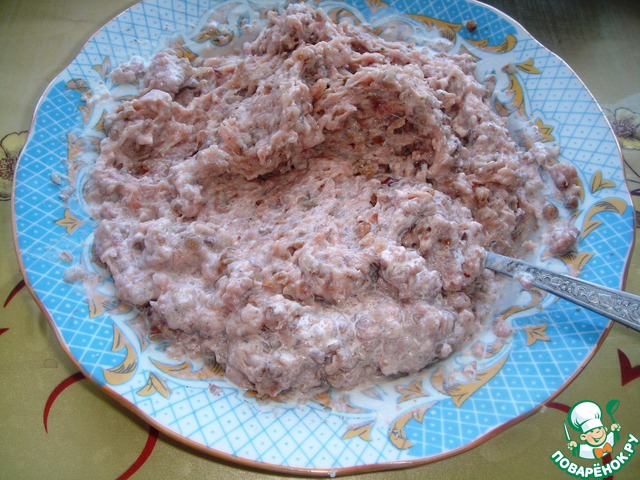 Перемешиваем сливки, гречку и фарш со специями, добавляем соль. Если не уверены насчет соли, можно отделить небольшой колобок и пожарить его, попробовать на соленость.