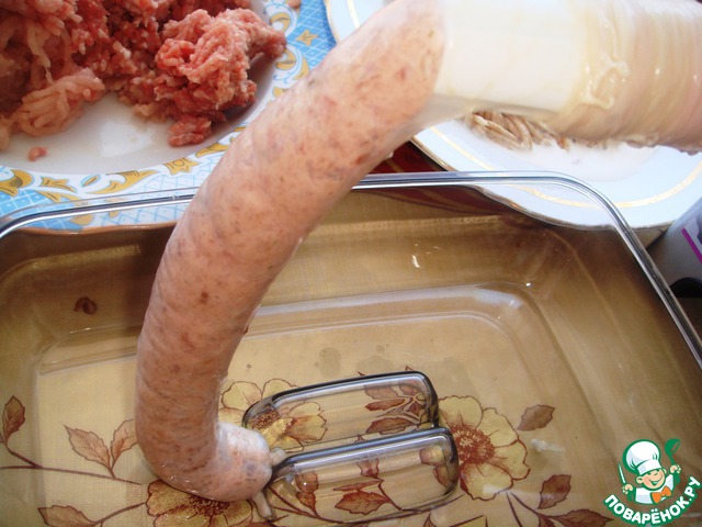 Череву натягиваем на специальную насадку мясорубки (если нет такой - то горлышко пластиковой бутылки обматываем скотчем, на него натягиваем, бутылку обрезаем и заполняем фаршем через бутылку).