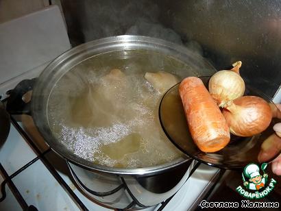 Добавляем в бульон морковь и лук, половину соли и готовим до тех пор, пока копыта полностью не разварятся. У каждого разное время, зависит от размера копыт и толщины стенок кастрюли, в которой готовится бульон. У меня томился бульон еще 1,5 часа