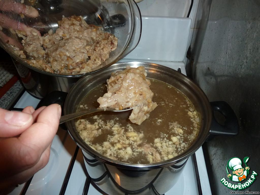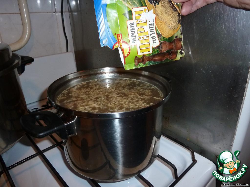 В процеженный бульон добавляем измельченную мякоть. Хорошо перемешать. Посолить. Довести до кипения.