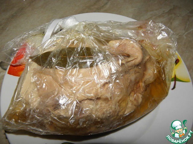 После того, как блюдо остыло, разрезать пакет, слить сок бульона в отдельную посуду, а мясо мелко нарезать.