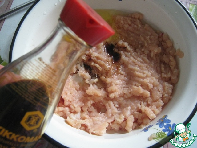 Пока соус выпаривается можно приготовить куриный фарш. Куриную грудку измельчить в блендере или мясорубке. Добавить яйцо, соевый соус, перец.