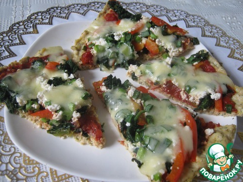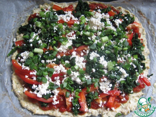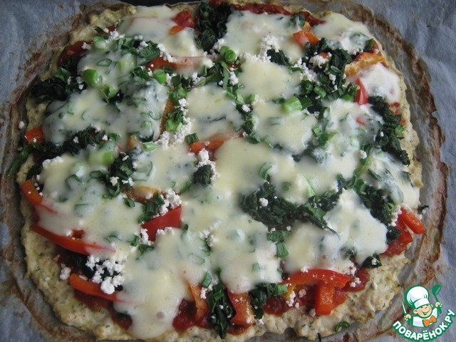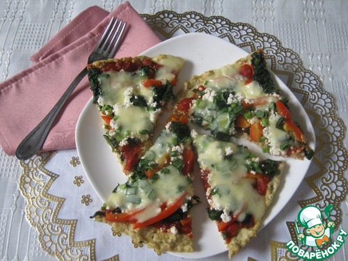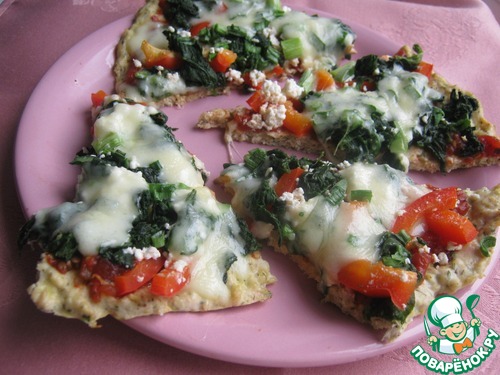 | Вкусная, полезная лепешка без муки-куриная основа, а сверху овощи, творог и шпинат. |