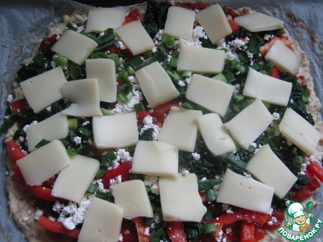 Кладём начинку- болгарский перец, шпинат, творог, зеленый лук.