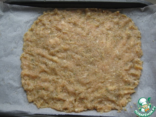 На бумаге для выпечки распределяем фарш тонким слоем, если прилипает, то мокрыми руками. Ставим в разогретую до 180 C духовку на 15 минут.