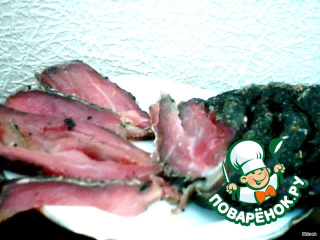 Разделываем ножку, удаляем кость и вырезаем сухожилия. Готовим рассол: соль и специи разводим в воде и ставим кипятить. Плотность рассола проверяем сырым яйцом . Яицо должно всплывать как говорят на "5 копеек" -т. е. чуть над рассолом.. Укладываем наше мясо в посуду и на сутки оставляем на столе. После того обсушиваем бумажными полотенциями. Обваливаем в пряностях, Состав не знаю -индийская, Но с явным привкусом мяты.