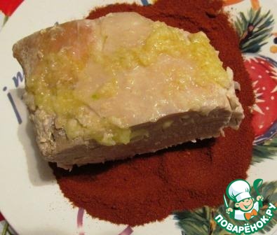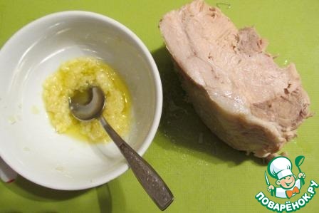 Кусок горячего мяса со всех сторон щедро обмазываем чесночной смесью.