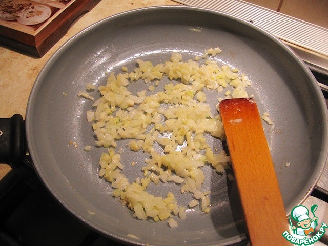 Пассируем, мелко нарезанный лук, тертый имбирь и чеснок на растительном масле.