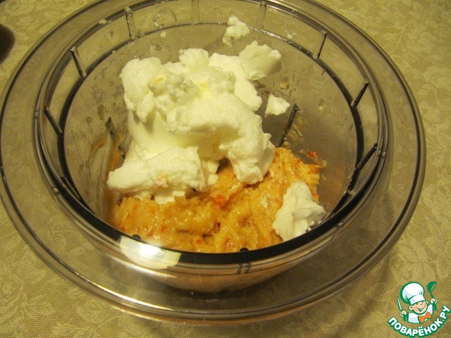 Куриное филе проворачиваем через мясорубку или измельчаем в блендере. К фаршу добавляем жареный лук со специями, измельченный сладкий перец, желтки, сливки, соль перец и хорошо взбиваем в блендере, до пышной массы. Аккуратно вводим белки и перемешивае
