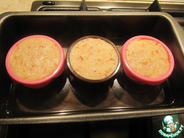 Берем формочки, раскладываем суфле и выставляем в глубокий противень. Наливаем в противень кипящей воды до середины формочек. Ставим в духовку при 180 град. на 15 мин.