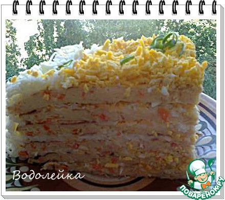 Вместо отварного яйца (для переслаивания коржей) можно использовать обжаренную морковку с луком, грибы, сыр или же овощи по сезону (помидоры, перец). Это уже по желанию.