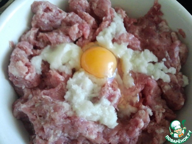 Берем мясной фарш (я люблю свиной, но думаю можно заменить на любой другой), добавляем яйцо и репчатый лук, измельченный блендером. Вымешиваем.