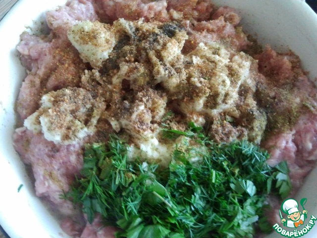 Добавляем хлеб, который мы предварительно залили теплой водой, мелко нарезаную зелень, соль, приправы. Все опять хорошо вымешиваем. Отправляем ненадолго в холодильник.