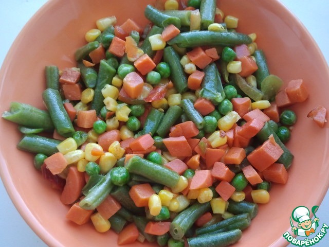 Смесь овощную немного обжариваем на сковородке, солим по вкусу. Даем остыть.