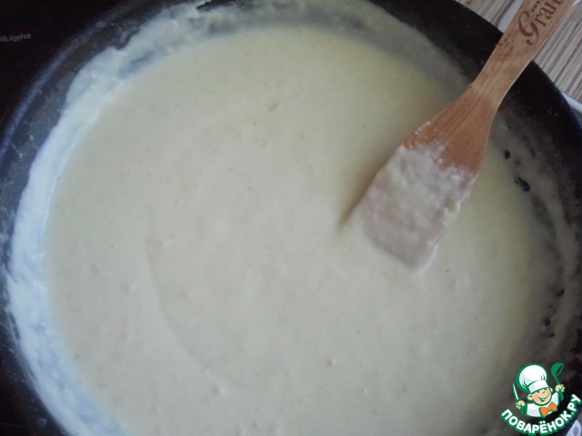 Всыпаем потихоньку просеянную муку, хорошо размешивая, вливаем теплое молоко, не переставая мешать, чтобы не было комочков. На среднем огне мешаем, пока не начнет загустевать. Добавляем немного мускатного ореха, соль по вкусу.