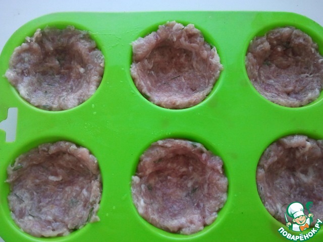 В формочки выкладываем фарш, делая в нем углубление. У меня формы силиконовые, слегка смазанные маслом.