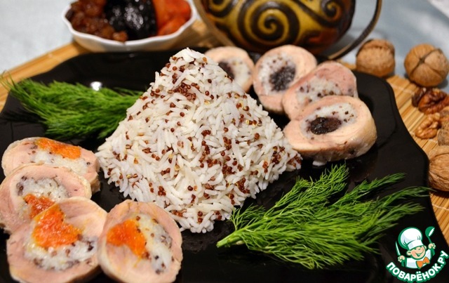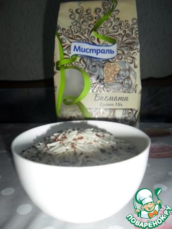 Для гарнира и для начинки взять рис Басмати киноа микс, залить водой отварить с момента закипания на небольшом огне минут 12-15. Поготовности слегка сбрызнуть маслом и лимонным соком.