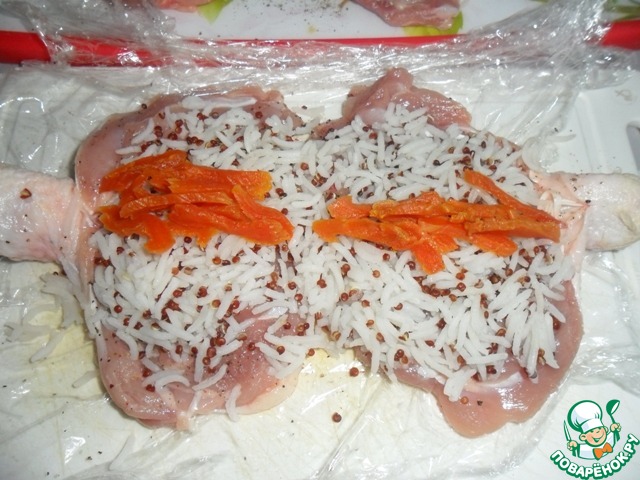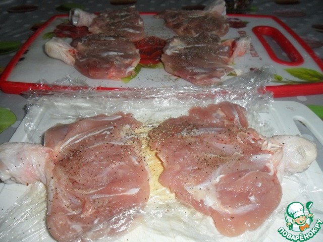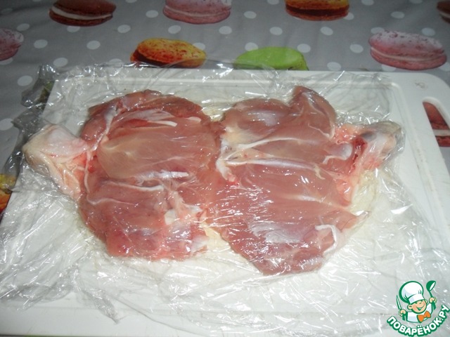 Выложить на пищевую пленку, посолить, слегка отбить между двумя слоями пленки.