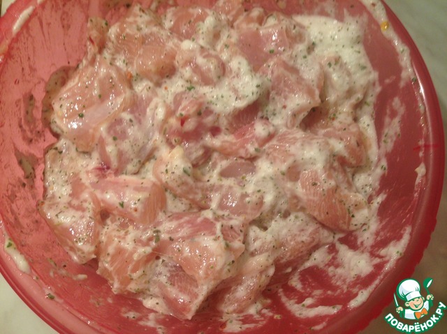 Мясо режем порционными кусочками, примерно 3x3 см (сильно мельчить не нужно). Добавляем туда специи, соль, соду, крахмал.