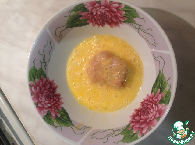 Теперь обмакиваем в яйце, затем снова в сухарях и на сковороду. Обжариваем на сильном огне со всех сторон, потом уменьшаем огонь и под крышкой доводим до готовности.