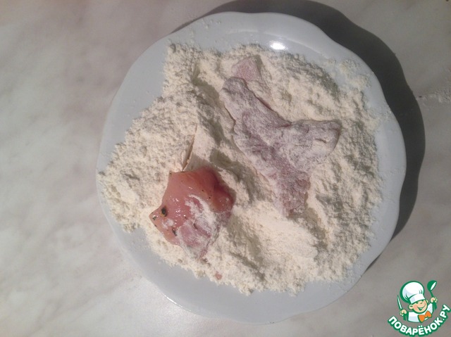 Еще один вариант жарки в муке. Просто обвалять в муке и на сковороду. Так же на сильном огне до румяной корочки и под крышкой до готовности. Во время жарки кусочки раздуваются немножко.