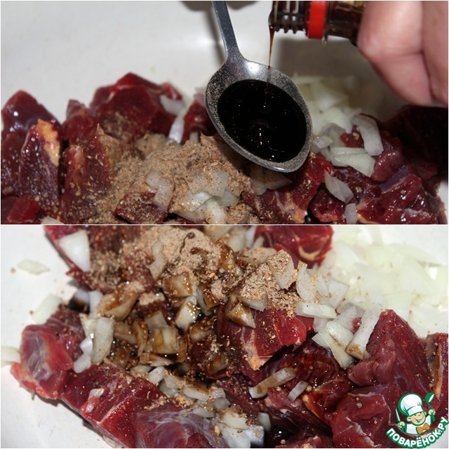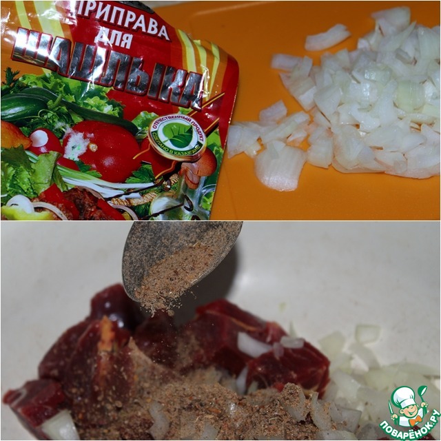 Высыпать лук к мясу, добавить 1 ст. л. приправы для шашлыка.