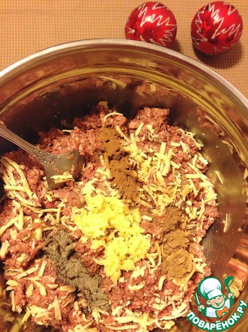 Добавим в фарш натертый имбирь, соль, корицу, мускатный орех, черный перец, разрыхлитель и натертый чеснок.