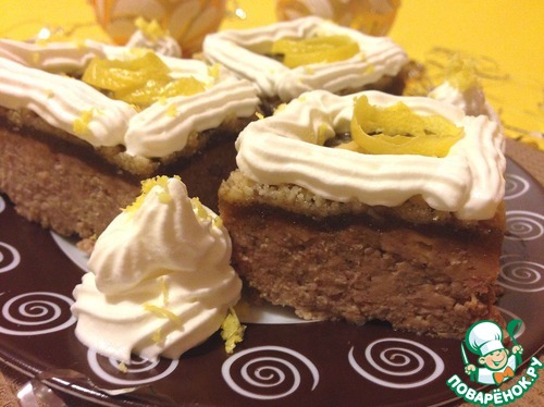 Не пугайтесь большого количества ингредиентов, все делается очень просто. Единственный необходимый момент - наличие у вас домашнего мармелада на агаре. Дело в том, что наше "пирожное" мы будем запекать, и если использовать мармелад на желатине, он быстро растает. Температура же плавления агара гораздо более высокая, и он сохранит устойчивость при запекании, а значит, обеспечит мармеладный слой в пирожном. Итак, все по-порядку. Сыр натрем на терке.