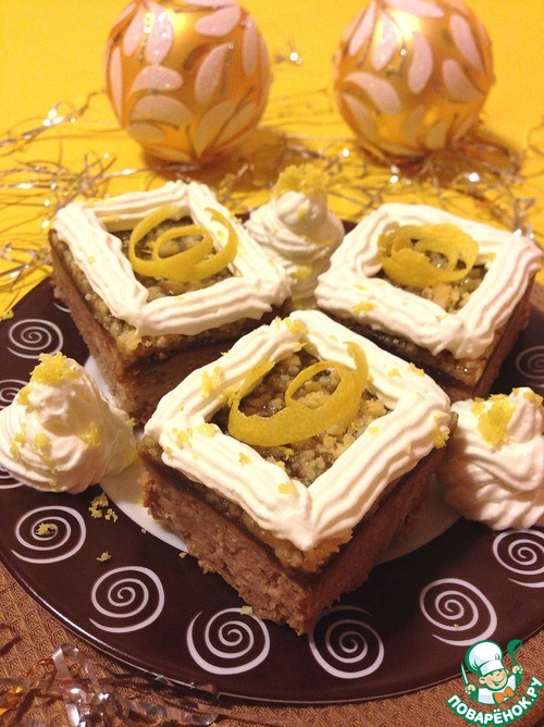 А теперь нарезаем на кусочки, украшаем взбитыми с солью сливками и цедрой лимона. И подаем. Надеюсь, на фото видно прослоечку из мармелада. Форму держит отлично. Режется ровно. Перед украшением и подачей подержите заготовку в теплом помещении. И кушаем с удовольствием! И удивляем гостей нетрадиционной подачей мясной закуски! Веселого Нового года!