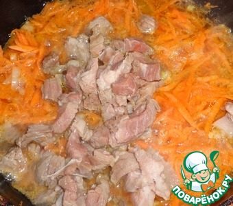 Лук мелко порезать, морковь натереть на крупной терке. Мясо порезать на кусочки. Лук, морковь и мясо тушим в сковороде 10-15 минут, залив половиной стакана воды. Посолить, поперчить по вкусу.
