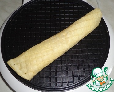 Испечь вафли в вафельнице. Свернуть в трубочку.