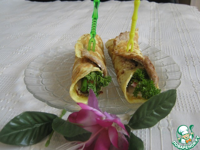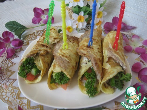 | Очень вкусная закуска, свежие овощи завёрнутые в яично-мясной блинчик. Готовить легко и просто, справится даже начинающий кулинар. Очень красиво будет смотреться на праздничном столе. |