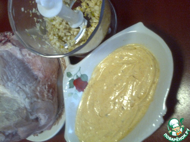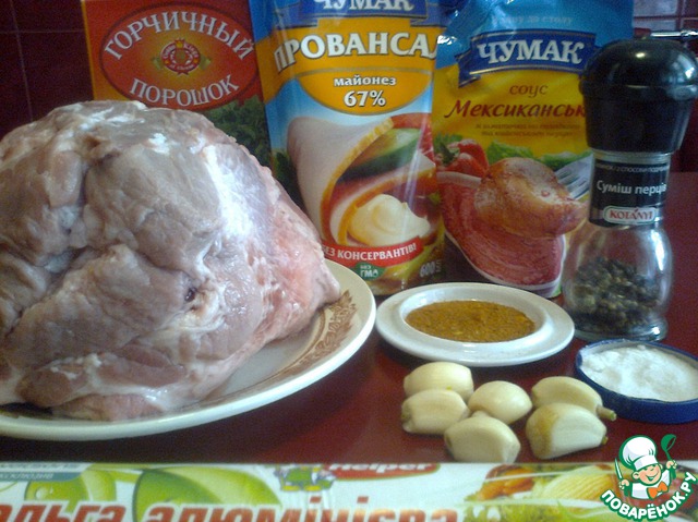 Теперь обмазываем мясо со всех сторон соусом и чесноком. Выкладываем на фольгу и заматываем. Выпекать в духовке при 180' С в течение 1,5 часа (если мяса больший кусок - тогда запекаем дольше).
