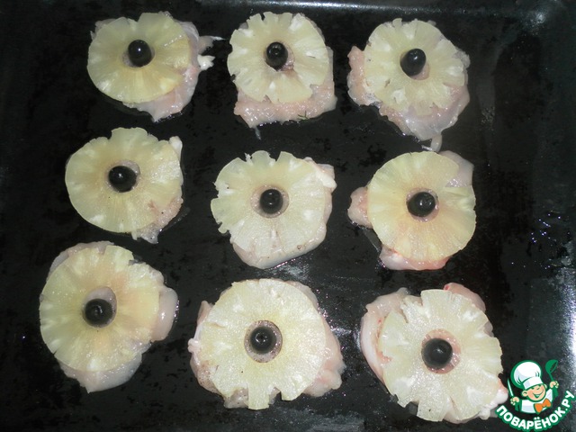 Шайбы ананаса извлекаем из банки, выкладываем поверх каждой отбивной.