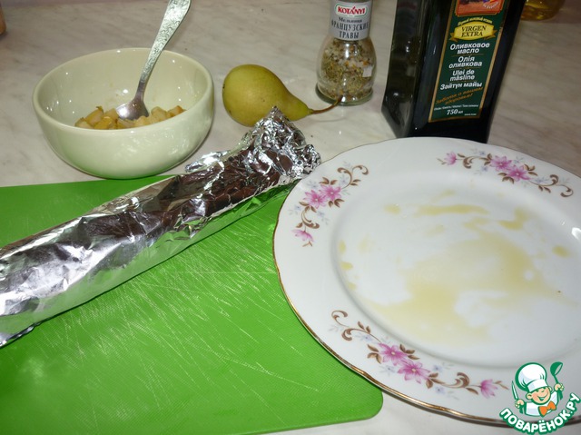 И в морозильник на пару часов. Кстати, в таком виде карпаччо отлично хранится, так что можно сделать его сильно заранее, а потом приготовить груши. Опыт показал, что карпаччо вкусно и с соевым соусом, и с табаско, и даже с горчицей некоторым понравилось! Так что выбор за вами!
